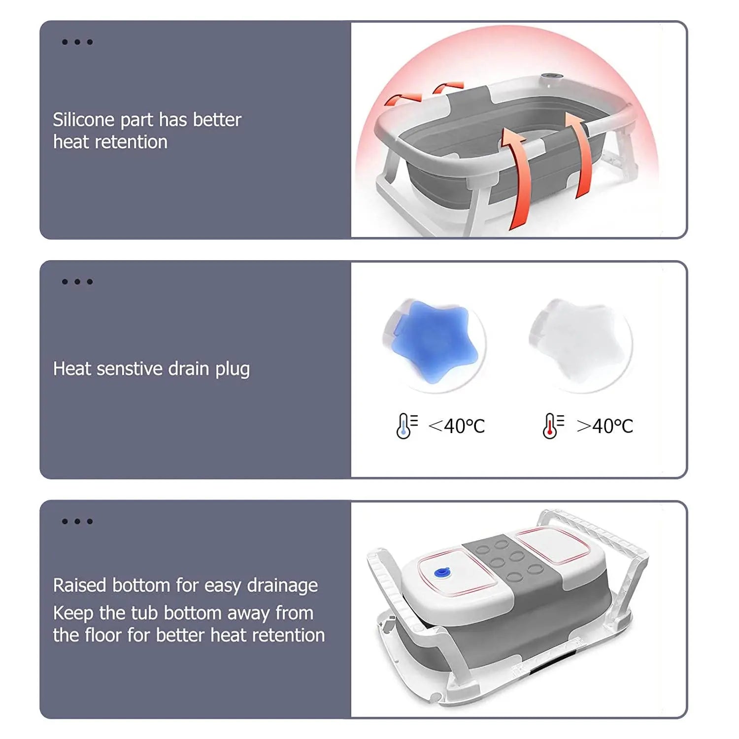TEMPERATURE SENSING BABY TUB - equipped with a smart bath thermometer that can monitor the water temperature in real time. A thoughtful addition that the color of the water plug turns clear white when the water temperature is higher than the safe zone (e.g. 40°C) to protect your baby's health and comfort.