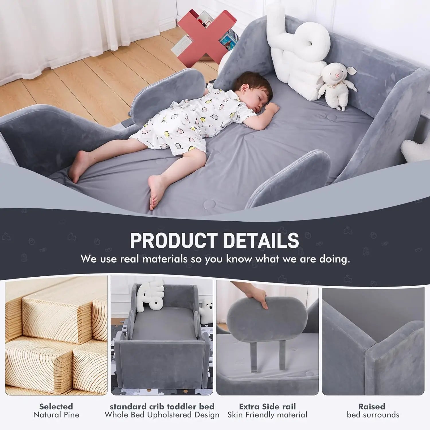 Toddler Bed, Kids' Bed with Safety Bar, Gray, Standard Crib Size